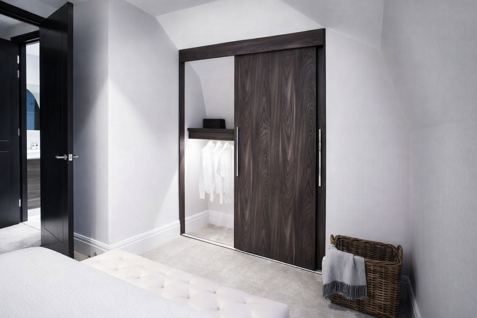 flat panelled sliding doors create a streamlined appearance that works perfectly in modern spaces. The design focuses on smooth surfaces, slim profiles and a refined, contemporary feel. With no protruding hinges or bulky detailing, the result is a clean, architectural finish that remains practical and visually balanced.