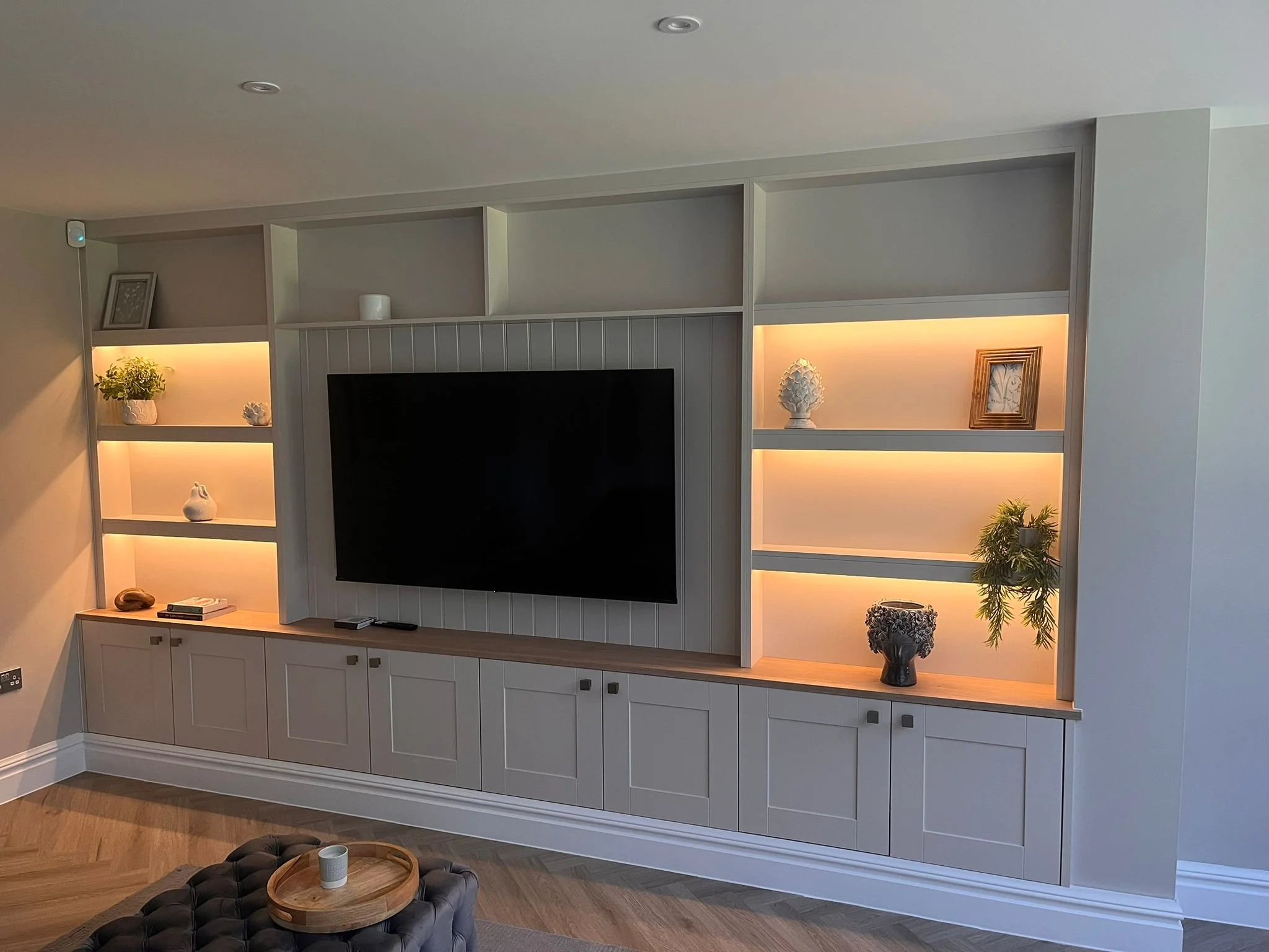 Spray painted media Unit with shaker doors , tongue and grooved centre panel and LEd strips lights with 36mm shelving